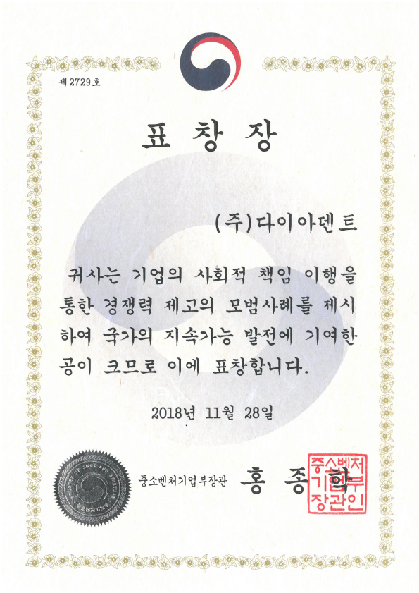 Certificate of Commendation awarded by the Minister of SMEs and Startups