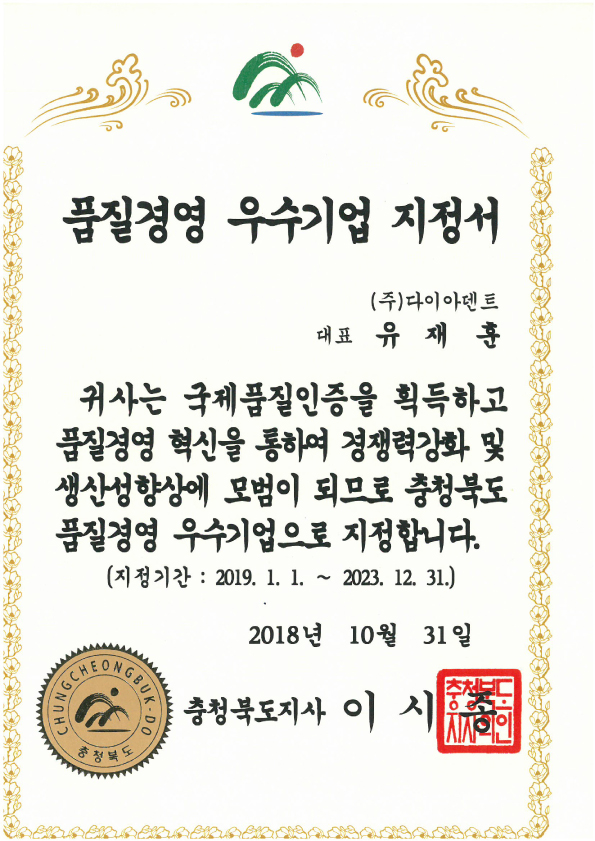 Certificate of Designation as an Excellent Company in Quality Management